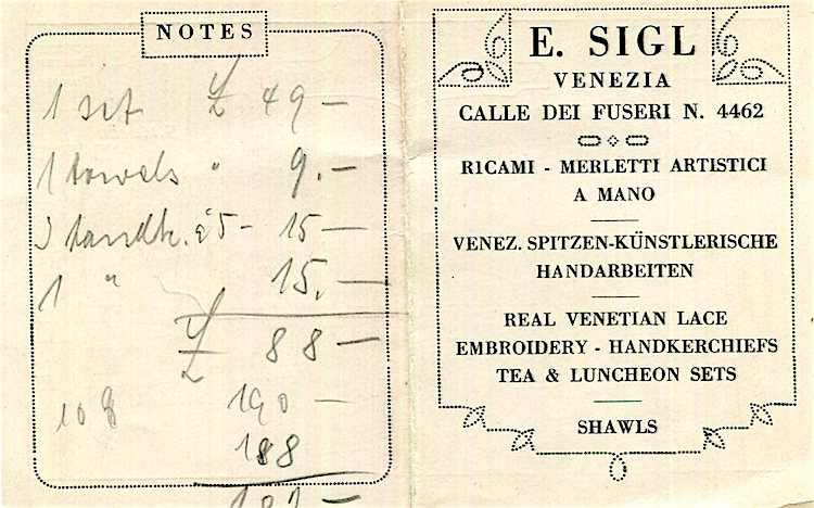 Italy Venice Commerce E. Sigl Business Card Lace 1930