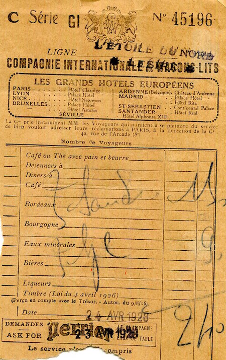 CIWL Nord Express Dining Car Receipt 1928
