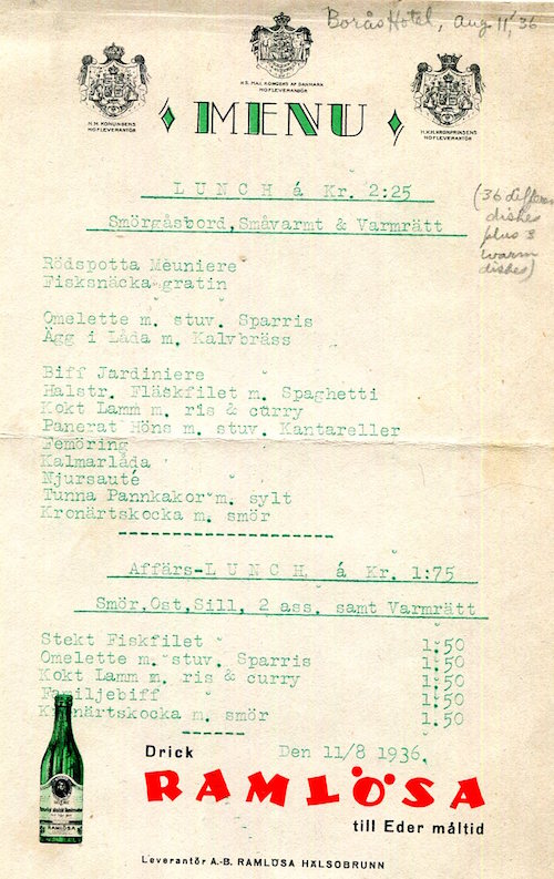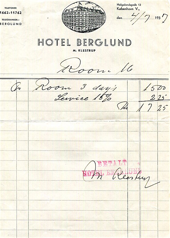 Denmark Copenhagen Hotel Berglund Receipt 1937
