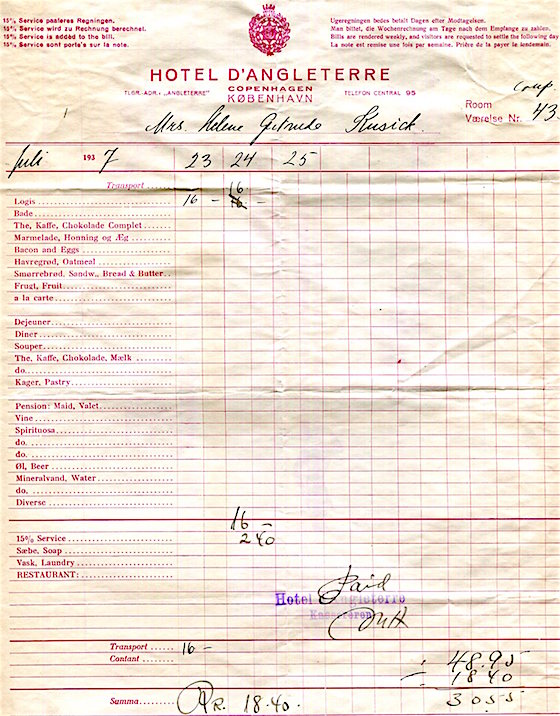 Denmark Copenhagen Hotel d Angleterre Receipt 1937