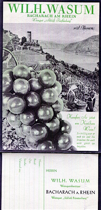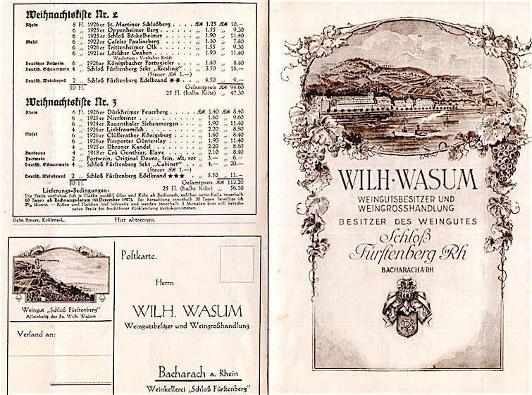 Germany Commerce Bacharach Am Rhein Wilhelm Wasum Schloß Fürstenberg Wine Price List 1938 Front