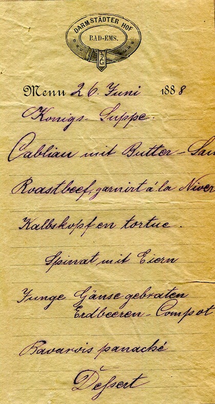 Germany Bad Ems Darmstädter Hof Menu 1888