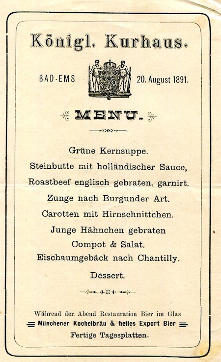 Germany Bad Ems Königliches Kurhaus Menu 1891