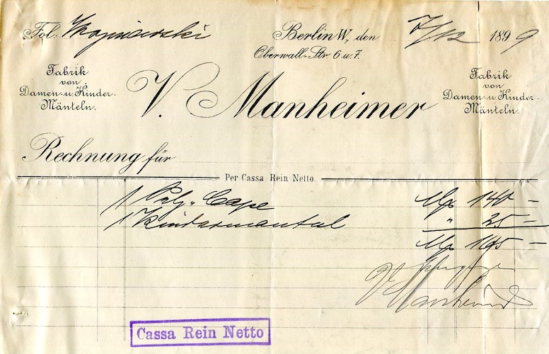 Germany Berlin Commerce V. Manheimer Factory Receipt 1899