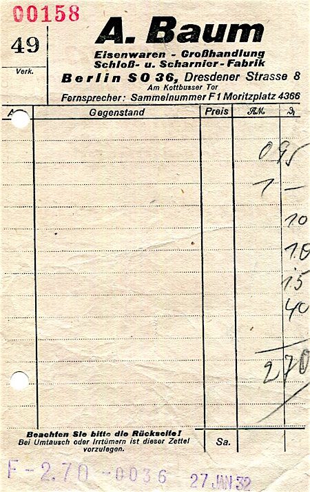 Germany Berlin Commerce A Baum Receipt 1932