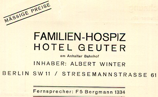 Germany Berlin Hotel Geuter Familien Hospiz Business Card 1920