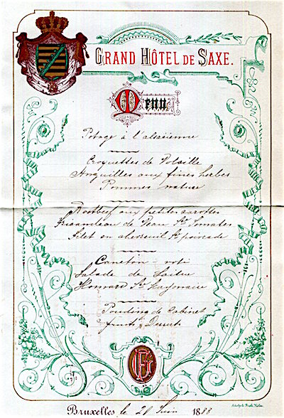 Belgium Brussels Grand Hotel De Saxe Menu 1888