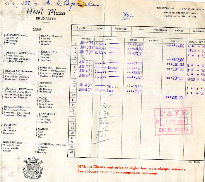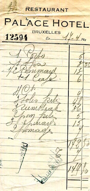 Belgium Brussels Palace Hotel Receipt 1925-2