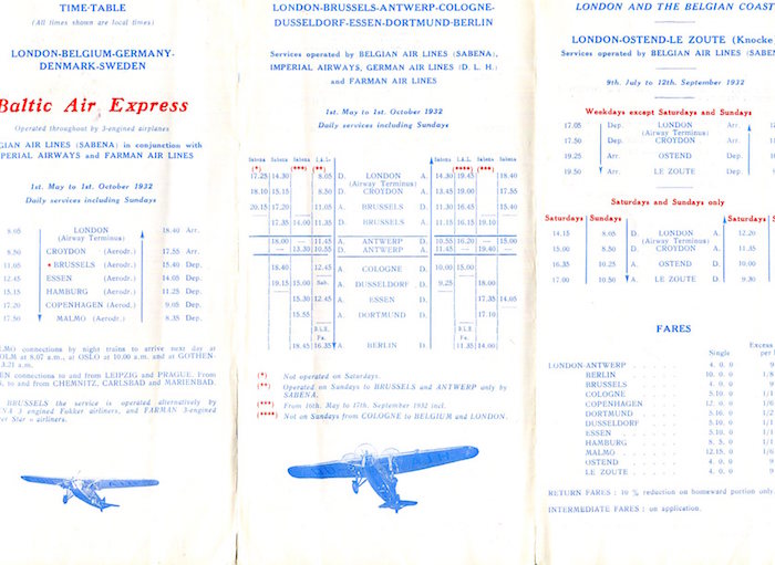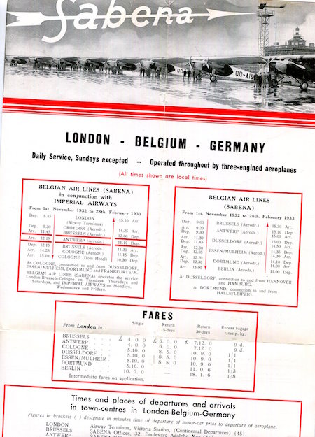 Belgium Transport Airline Sabena Timetable 1932-1933 Inside