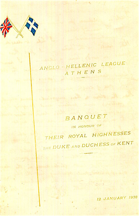 Greece Athens Hotel Grande Bretagne Menu Anglo Hellenic League Duke Duchess Of Kent 1938 Front