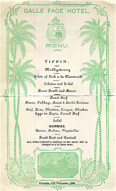Ceylon Colombo Galle Face Hotel Menu 1909