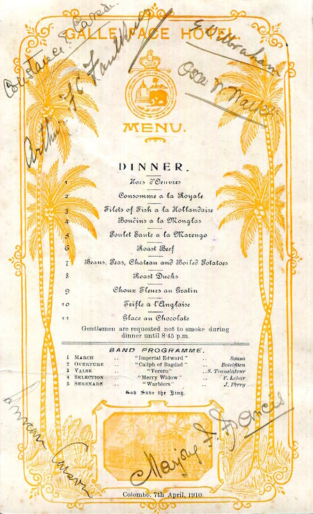 Ceylon Colombo Galle Face Hotel Menu 1910