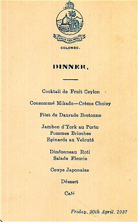 Ceylon Colombo Galle Face Hotel Menu 1937
