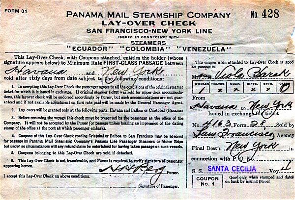 Panama Transport Steamship Panama Mail Grace Line SS Cecilia Lay Over Check 1931