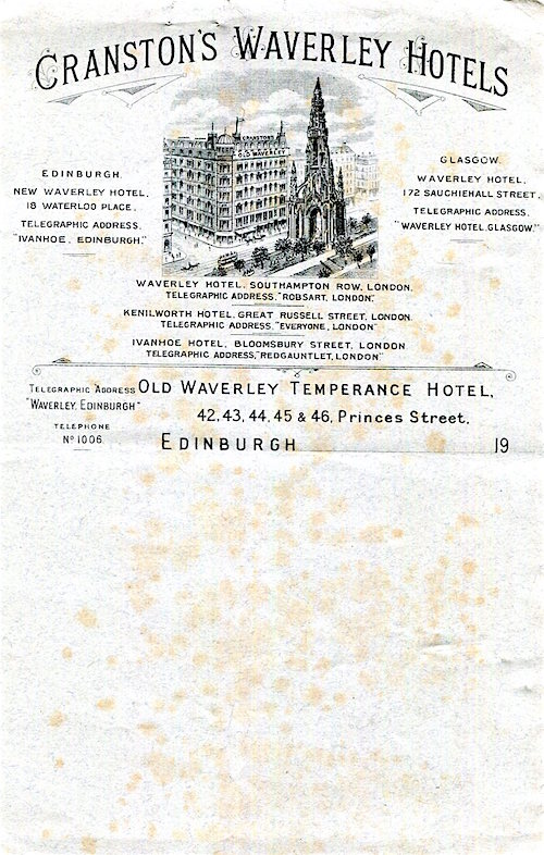 Scotland Edinburgh Cranstons Waverly Hotels Stationery 1910