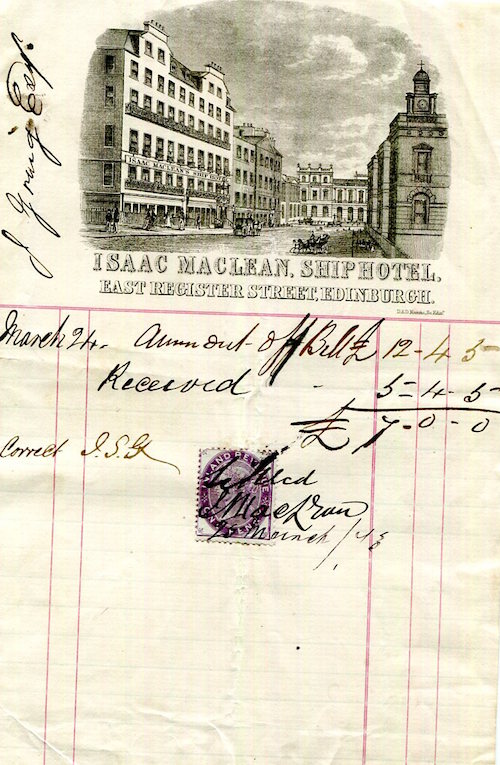 Scotland Edinburgh Isaac Maclean Ship Hotel Receipt 1875