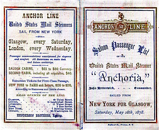 Scotland Transport Steamship Anchor Line Anchoria Passenger List 1878 Front