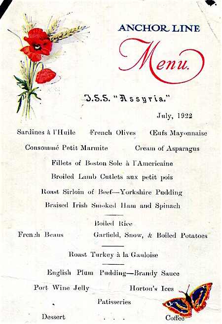 Scotland Transport Steamship Anchor Line Assyria Menu 1922