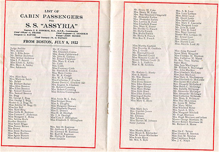 Scotland Transport Steamship Anchor Line Assyria Passenger List 1922 Inside