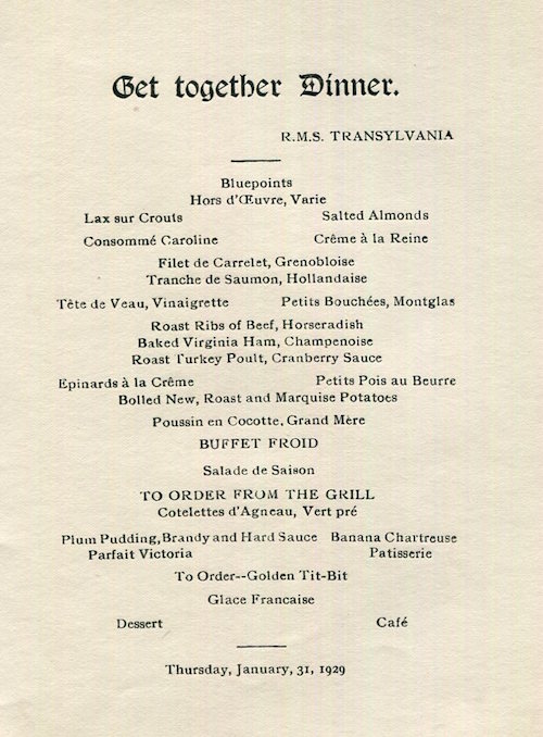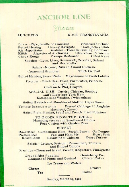 Scotland Transport Steamship Anchor Line Transylvania Menu 1929-1 Front