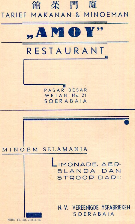 Dutch East Indies Java Soerabaia Amoy Restaurant Menu 1937 Front