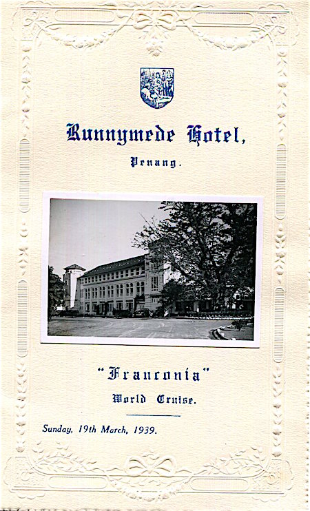 Straits Settlements Penang Runnymede Hotel Menu 1939 Front