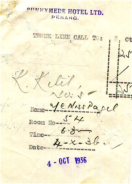 Straits Settlements Penang Runnymede Hotel Receipt Trunk Line Call 1936