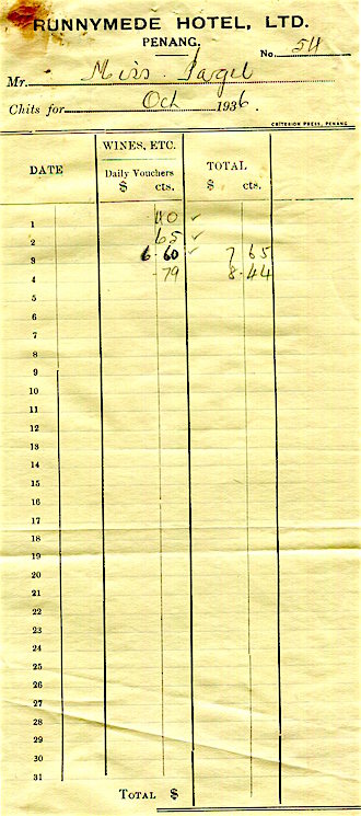 Straits Settlements Penang Runnymede Hotel Receipt Wine Charges 1936