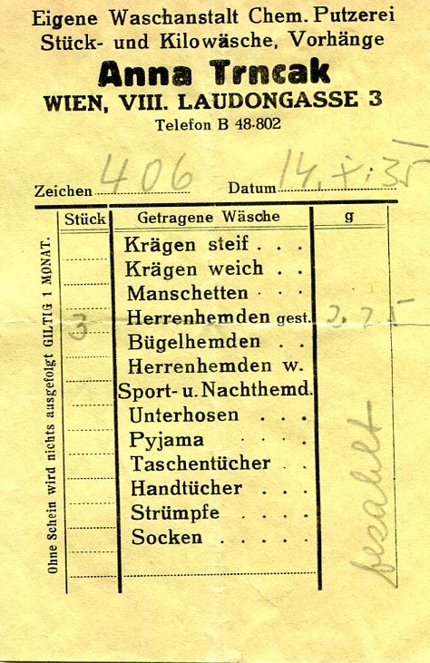Austria Vienna Commerce Anna Trncak Laundry Receipt 1935