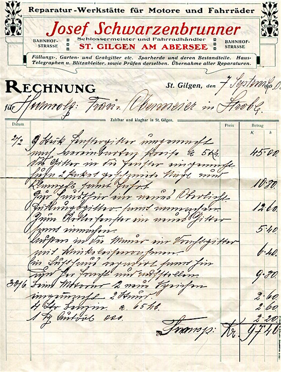 Austria Commerce St Gilgen Josef Schwarzenbrunner Metal Items Receipt 1908