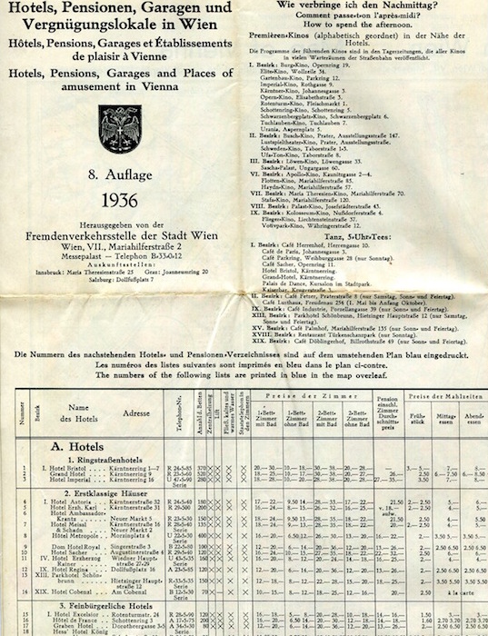 Austria Vienna Hotels Leaflet 1936