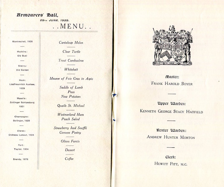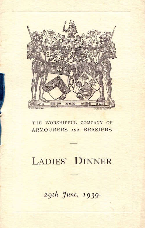 England City Of London Armourers & Brasiers Guild Menu 1939 Front