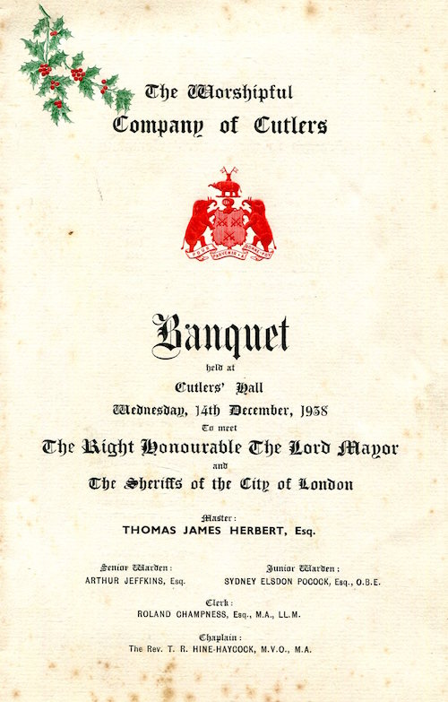 England City Of London Cutlers Hall Menu 1938 Front