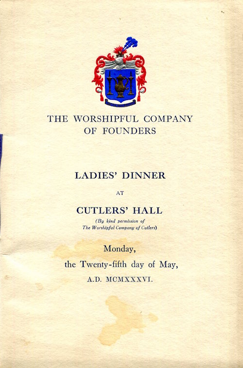 England City Of London Cutlers Hall Worshipful Company Of Founders Menu 1937 Front