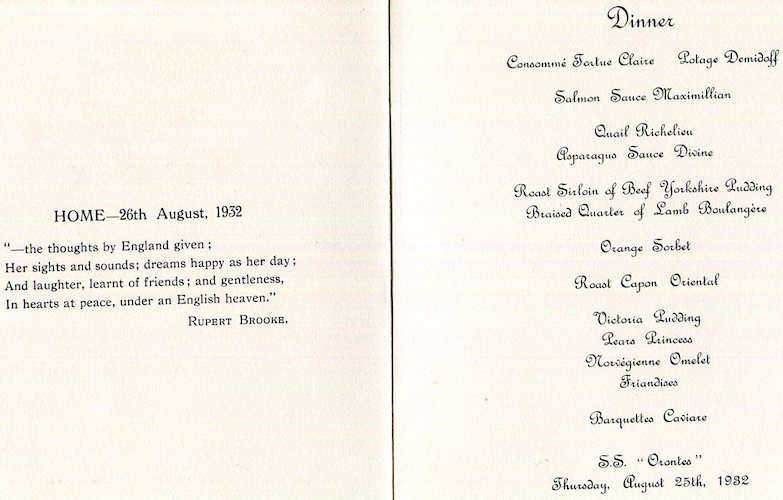 England Transport Steamship Orient Line SS Orontes Menu Landfall Dinner 1932 Front