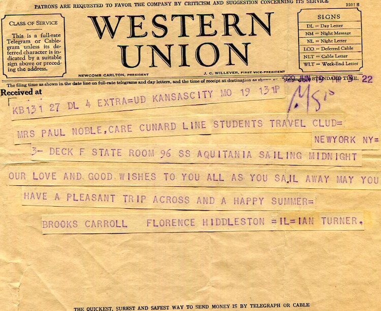 • England Transport Steamship Cunard Line SS Aquitania Western Union Telegram 1929-2